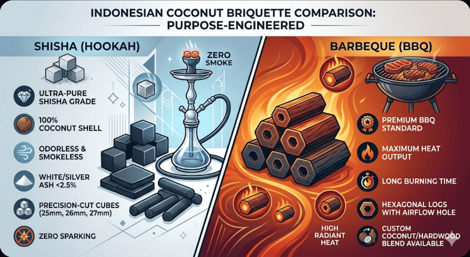 In the global charcoal trade, one of the most common—and costly—mistakes new importers make is assuming "charcoal is just charcoal." Selling a BBQ-grade briquette to a premium shisha lounge is a fast track to lost clients. As a leading Indonesian manufacturer, we produce both, but they are engineered entirely differently.